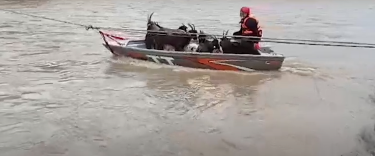 სოფელ ქვახვრელთან უხვი ნალექის გამო წარმოქმნილი კუნძულიდან მაშველებს წვრილფეხა პირუტყვი ნავით გამოჰყავთ