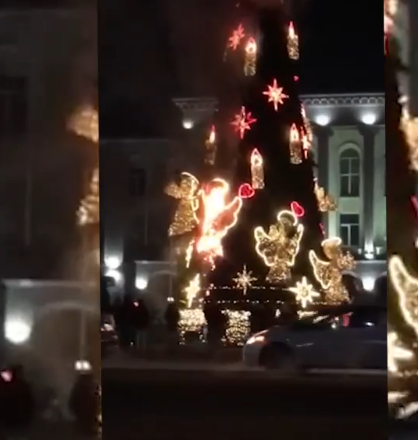 გორში მთავარ ნაძვის ხეს ცეცხლი გაუჩნდა (ვიდეო)
