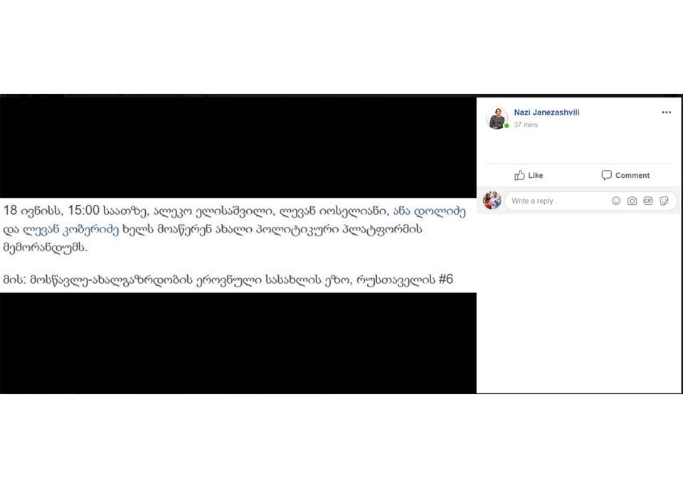 ნაზი ჯანეზაშვილი აქვეყნებს ინფორმაციას, თუ რომელ პოლიტიკოსებთან ერთად აპირებს ანა დოლიძე დღეს ახალი პოლიტიკური პლატფორმის მემორანდუმზე ხელმოწერას.
