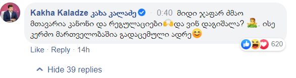 "მიდი, ჯაფარ, ძმაო, მთავარია კანონი და რეგულაციები და ვინ დაგიშალა?"- ამ კომენტარით გამოეხმაურა თბილისის მერი კახა კალაძე გირჩის ლიდერის Facebook-ლაივს.