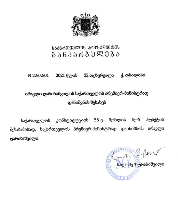 სალომე ზურაბიშვილმა ირაკლი ღარიბაშვილის პრემიერ-მინისტრად დანიშვნის განკარგულებას ხელი მოაწერა