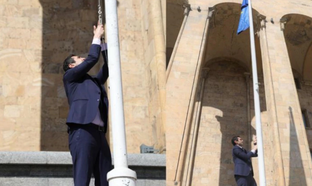Снятый радикалами флаг ЕС на проспект Руставели вернул лично спикер парламента