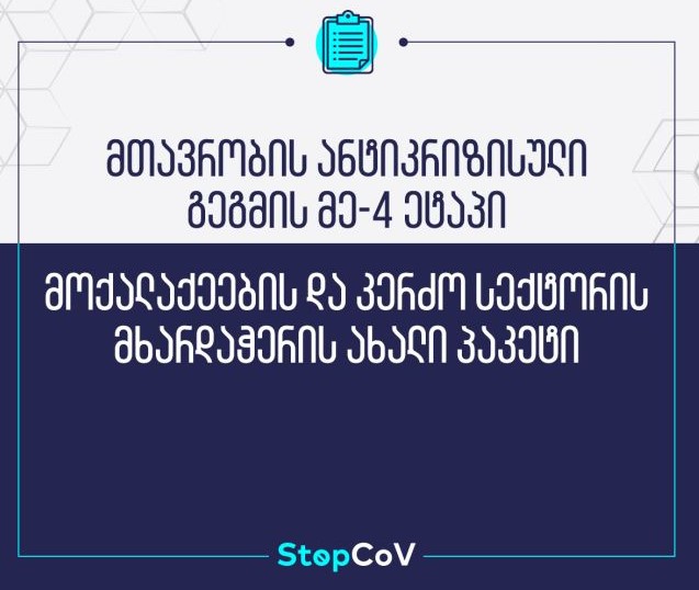 საქართველოში არსებული ეპიდემიოლოგიური ვითარების გათვალისწინებით პრემიერ-მინისტრის ხელმძღვანელობით მოქმედმა უწყებათაშორისმა საკოორდინაციო საბჭომ ანტიკრიზისული გეგმის მეოთხე ეტაპის ფარგლებში მოქალაქეების და კერძო სექტორის მხარდაჭერის ახალი პაკეტი მიიღო.