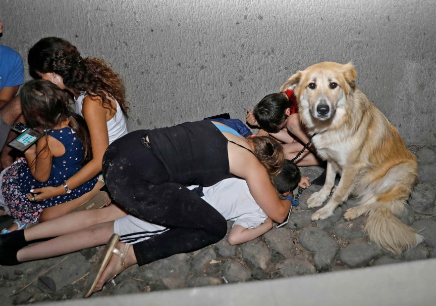 ფოტო: AFP, ისრაელი, თელ–ავივი, ღაზადან სარაკეტო იერიშის დროს ოჯახი თავშესაფარში