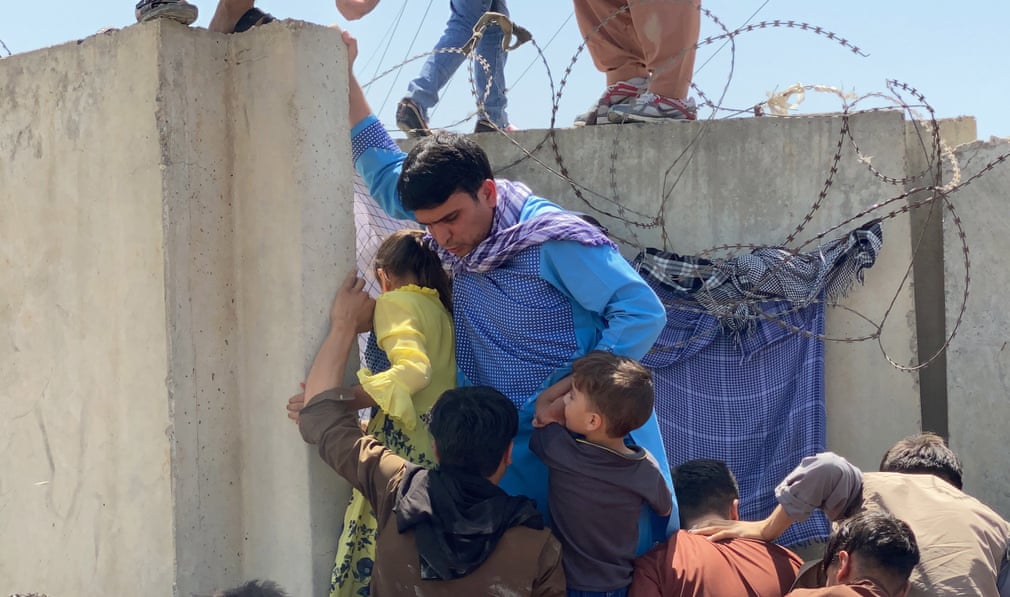 2021 წლის 16 აგვისტო; ხალხი აეროპორტის ღობეზე ბავშვების გადაყვანას ცდილობს. ფოტო – EPA.