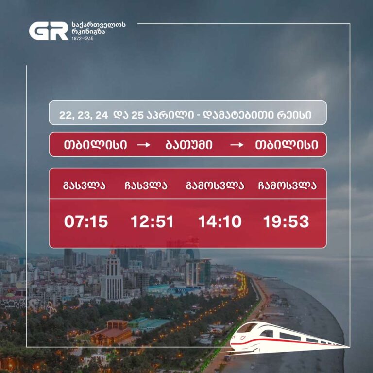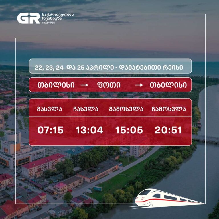 აღდგომის დღესასწაულთან დაკავშირებით, 22, 23, 24 და 25 აპრილს თბილისი-ბათუმისა და 21, 22, 23, 24 და 25 აპრილს თბილისი-ფოთის მიმართულებით საქართველოს რკინიგზა დამატებით რეისებს ნიშნავს.